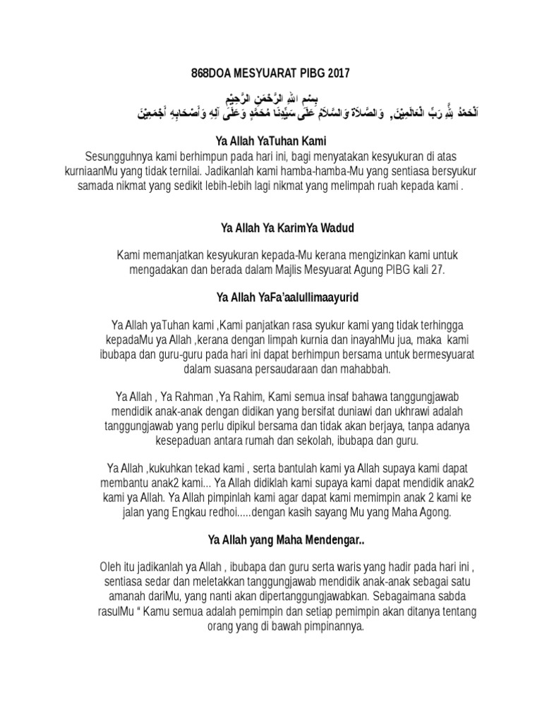 Doa mesyurat pibg. Doa doa majlis rasmi sekolah spim jps murni. Sekolah anda akan menganjurkan mesyuarat agong PIBG pasti anda tercari-cari teks ucapan untuk pengacara majlis tersebut.